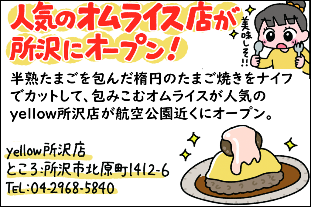 半熟たまごを包んだ楕円のたまご焼きをナイフでカットして、包みこむオムライスが人気のyellow所沢店が航空公園近くにオープン。